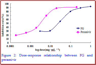 To investigate the in vitro anti-viral effect of fructopyrano-(1→4)-glucopyranose (FG) from traditional Chinese medicine Radix isatidis, dog kidney cells (MDCK) were with treated with either FG and then with virus (Group A); virus and then with FG (Group B); or FG and virus simultaneously (Group C). Results showed the in vitro cell protection rate and virus inhibition rate increased significantly with the increase of FG concentration when compared with cells without FG treatment (p<0.01). The anti-viral effect was the best in Group C and that in Group A was superior to that in Group B. FG could exert significant inhibited effect on neuraminidase activity with the IC50 of 0.07 mmol/mL and on hemagglutinin of avian influenza virus with minimum inhibitory concentration of 3.13 mg/mL. Our findings indicate FG can confer obvious antiviral effects on influenza A virus in vitro.