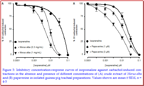 Crude extract of Morus alba at 100 mg/kg exhibited protective effect against castor oil-induced diarrhea in mice. In isolated rabbit jejunum, M. alba (0.3-10 mg/mL) inhibited the spontaneous contractions and caused glibenclamide-sensitive inhibition of low K+ (20 mM)-induced contractions, with mild effect on high K+ (80 mM). Similarly, cromakalim caused inhibition of low K+, but not of high K+, while verapamil did not differentiate in its inhibitory effect on two concentrations of K+. M. alba (3.0-30 mg/kg) caused suppression of carbachol (100 µg/kg)-induced increase in inspiratory pressure of anaesthetized rats. In guinea-pig trachea, M. alba completely inhibited low K+ contractions, with partial effect on high K+. M. alba (0.3-1.0 mg/mL) caused leftward shift of isoprenaline-induced inhibitory concentration response curves, like papaverine. These results indicate that M. alba possesses a combination of KATP channel opening, weak Ca++-antagonist and phosphodiesterase inhibitory mechanisms, which explain its medicinal use in hyperactive gut and airways disorders.