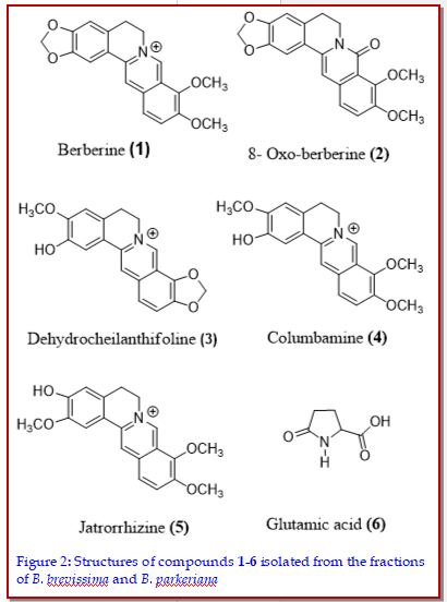 Methanol extracts of the roots of B. brevissima and B. parkeriana were examined for antidiabetic and antimicrobial activities. Six compounds i.e berberine, 8-oxo-berberine, dehydrocheilanthifoline, columbamine, jatrorrhizine and gluta-mic acid were isolated from the active fractions of these species for the first time. The antidiabetic activity was determined against Protein Tyrosine Phosphatase 1B (PTP 1B), a negative insulin regulator while the antimicrobial activity was performed against four bacterial strains: Mycobacterium marinum ATCC BAA535, sporadic Methicillin Resistant Staphylococcus aureus (SMRSA), endemic Methicillin Resistant Staphylococcus aureus (EMRSA) and Escherichia coli ATCC.8739 at different concentrations. Amongst the isolated compounds 8-oxo-berberine was found to be the most active antidiabetic (29 % of the positive control) while jatrorrhizine was the most active and selective antimicrobial against SMRSA and EMRSA (-1.2% of the DMSO (D) control).