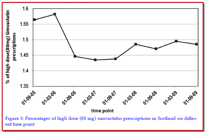 Statins are highly effective in managing hypercholesterolaemia in patients with or without chronic heart disease due to extensive evidence for safety, efficacy and cost effectiveness. Observational cross sectional retrospective cohort study was done in approximately 200 primary care practices in Scotland. Frequency, rates and time trends for statin prescriptions together with demographic data and the prescribing patterns for high dose simvastatin and newer statins in its place was measured. 63%, 27%, 5%, 4% and 1% patients were prescribed simvastatin, atorvastatin, pravastatin, rosuvastatin and fluvastatin respectively (n=1,91370). Prevalence for individual statin as well as for all statin prescriptions, significantly increased (p<0.05). Except rosuvastatin the incidence of other statins prescription significantly decreased (p<0.05). The highest number of patients, 884 (24%) switched to atorvastatin from high dose simvastatin. Increase in prevalent use and decrease in incident use of statins, implies the diminished cardiovascular disease related mortality and subsequent increased life expectancy of patients with cardiovascular disease.