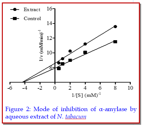 Inhibition of some carbohydrate metabolizing enzymes is one of the modes of action of antihyperglycemic agents. The aim of this study was to investigate the in vitro inhibition of α-amylase and α-glucosidase by extracts of N. tabacum leaf. Powdered leaves were extracted with acetone, ethanol and water, and tested for their ability to inhibit α-amylase from Aspergilus oryzae and α-glucosidase from Saccharomyces cerevisae. The results revealed that aqueous extract of the plant was most effective inhibitor of α-amylase (IC50 5.70 mg/mL) while acetone extract exhibited the best inhibitory potential on α-glucosidase (IC50 4.50 mg/mL). Kinetic studies showed that the mode of inhibition of α-amylase by aqueous extract was non-competitive while that of the acetone extract on α-glucosidase was competitive. The observed inhibitions of α-amylase and α-glucosidase suggest that the leaf extracts of N. tabacum may be useful in the management of Diabetes mellitus, which may due to the presence of phytochemicals.