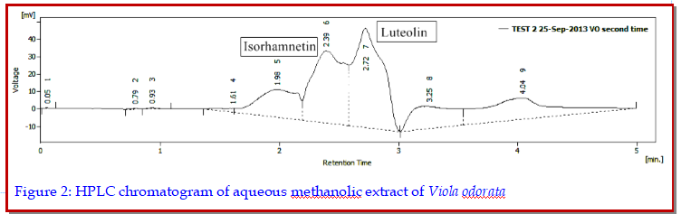 Traditionally Viola odorata is used for liver protection. To provide scientific support to its traditional use, aqueous methanolic extract of V. odorata (250 mg/kg and 500 mg/kg) was given to mice intoxicated with paracetamol. Obtained results demonstrated that the extract significantly (p<0.01-0.001) reduced paracetamol induced increase levels of serum hepatic enzymes and total bilirubin. Histopathological studies showed that the plant attenuated the hepatocellular necrosis and inflammation. HPLC results showed the presence of hepatoprotective flavonoids (isorhamnetin and luteolin) in the extract. It was concluded from the present study that V. odorata has hepatoprotective activity against paracetamol-induced liver injury in mice.