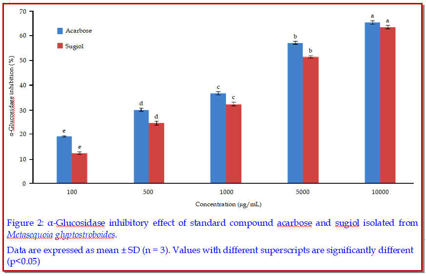 Nowadays use of plant derived natural compounds have become a topic of increasing interest in food and medicine industries due to their multitude of biological and therapeutic properties. In this study, a diterpenoid compound sugiol, isolated from Metasequoia glyptostroboideswas evaluated for α-glucosidase and tyrosinase inhibitory efficacy in terms of its potent anti-diabetic and anti-melanogenesis potential, respectively. As a result, sugiol at the concentration range of (100-10,000 µg/mL) and (20-500 µg/mL) showed potent efficacy on inhibiting α-glucosidase and tyrosinase enzymes in vitro ranging from 12.34-63.47% and 28.22-67.43%, respectively. These findings confirm the therapeutic potential of diterpenoid compound sugiol from M. glyptostroboides as a novel candidate for using in food and medicine industry which may have practical potential to cure skin and diabetes mellitus type-2 related disorders.