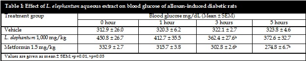 Hypoglycemic activity of aqueous leaf extract of Limonia elephantum in alloxan-induced diabetic rats