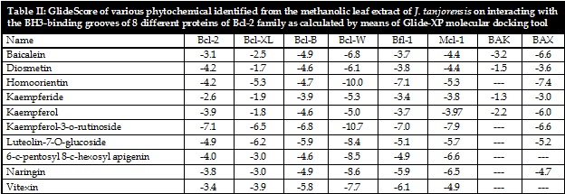 LC/ESI/MS/MS data analysis on the phytoconstituents of methanolic extract of Jatropha tanjorensis leaves revealed the presence of abundant flavone glucosides (homoorientin, kaempferol-3-o-rutinoside, luteolin-7-o-glucoside, 6-C-pentosyl-8-C-hexosyl apigenin, naringin and vitexin), flavonol (kaempferol and kaempferide) and flavones (baicalein and diosmetin). We, herein, demonstrated that methanolic extract of J. tanjorensis possess DPPH free-radical scavenging activity (IC50 of 49.7 µg/mL), inhibition of lipid peroxidation activity (IC50 of 189.6 µg/mL) and anticancer activity through MTT assay against EAC cells (IC50 of 14.57 µg/mL) and Caco-2 cells (IC50 of 21.0 µg/mL). In silico analysis indicated that cytotoxic activity of the methanolic extract of J. tanjorensis could be attributed to the presence of vitexin and 6-C-pentosyl-8-C-hexosyl apigenin as evidenced by exhaustive molecular docking studies carried out against 8 proteins of Bcl-2 family that play essential role in apoptosis. Moreover, drug-likeness properties of the leads and scopes to develop them as potent anticancer compounds are discussed.