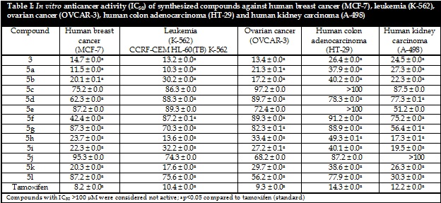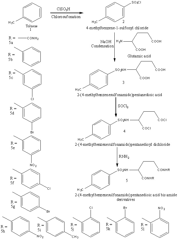 In the present work few novel 2-(4-methylbenzenesulphonamido)pentanedioic acid bis amide derivatives and the basic compound 2-(4-methylphenylsulfonamido)pentanedioic acid have been synthesized, characterized and screened for their possible antineoplastic activity both in vitro and in vivo. The in vitro activity was performed against five human cell lines like human breast cancer (MCF-7), leukemia (K-562), ovarian cancer (OVACAR-3), human colon adenocarcinoma (HT-29) and Human kidney carcinoma (A-498). The in vivo activity was performed in female swiss albino mice against Ehrlich ascites carcinoma (EAC). Among the synthesized compounds, ureide, anilide, p-nitoanilide and o-bromoanilide derivatives of 2-(4-methyl benzene sulphonyl)-pentanedioic acid bis amides showed encouraging activity in both the in vitro and in vivo compared to other compounds.