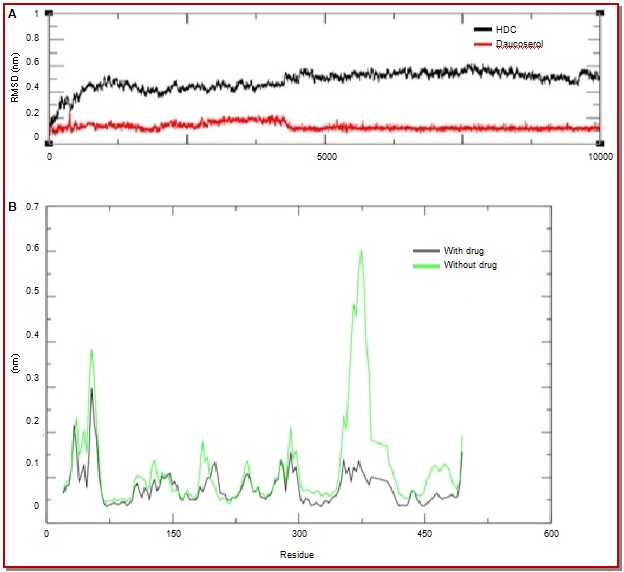 Allergic transfusion reaction is an anomaly that develops within several hours of transfusion which is usually treated by antihistamine. In the present study, we are looking into daucosterol, an extract of Traditional Chinese Medicine (TCM) Cordyceps, as a potential inhibitor of histidine decarboxylase. The approach of molecular docking and Molecular Dynamics Simulation (MDS) on a traditional anti-inflammatory Chinese medicine gave an atomic insight of the inhibition. The daucosterol was binding with a ?G of -3.17 Kcal/mol, to inhibit histamine synthesis by binding to histidine decarboxylase, possibly via the flexible catalytic loop. Such inhibitors that were designed to block the flexibility of the catalytic loop are potential candidates for further drug development program.