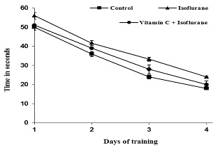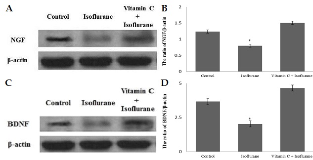Developmental abnormalities, neuronal apoptosis and associated cognitive impairment following isoflurane exposure in neonatal rodents have been reported. The study was undertaken to investigate the effect of vitamin C supplementation against isoflurane-induced neurotoxicity. Seven day old rats were exposed to 1.1% isoflurane, or air for 6 hours. Treatment groups were administered with vitamin C (30 mg/kg, orally) from postnatal day 1 (P1) to P10 and were exposed to isoflurane on P7. Isoflurane exposure induced apoptosis was determined by Fluoro-Jade C and terminal deoxynucleotidyl-transferase-mediated 2-deoxyuridine 5-triphosphate nick-end labeling assay. Vitamin C considerably improved memory and learning impairments, modulated neuroapoptosis and improved expressions of brain-derived neurotrophic factor, nerve growth factor, Bcl-xL and decreased activated caspase-3 expressions. Thus, vitamin C effectively offered protection against isoflurane-induced neuronal apoptosis, learning and memory disturbances.