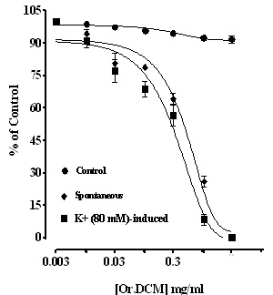 Crude extract of Oligochaeta ramosa and its fractions were studied to rationalize its traditional use in GIT disturbance. In spontaneous contracting jejunum preparation, O. ramosa (0.01-1.0 mg/mL) caused a transient spasmogenic effect followed by the spasmolytic effect at higher doses (3.0-10.0 mg/mL). In atropinized jejunum preparation, O. ramosa inhibit the spontaneous and K+ (80 mM)-induced contraction at the similar doses (0.01-1.0 mg/mL), suggesting calcium channel blocking effect. The calcium channel blocking effect was confirmed when pretreatment of tissue with O. ramosa produced a dose-dependent shift in Ca+2 dose- response curve to the right, similar to that produced by the verapamil. Activity-directed fractionation revealed that the spasmolytic effect is concentrated in the dichloromethane fraction while, aqueous fraction contains both spasmogenic and spasmolytic constituents. This study validate the presence of both spasmogenic and spasmolytic components mediated through muscarinic receptor activation and calcium channel blockade respectively, which may explain its traditional uses in constipation and diarrhea.