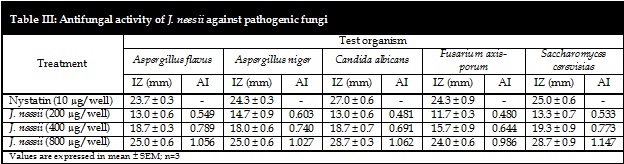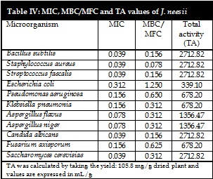 Agar well diffusion method was used to evaluate the antimicrobial potential of Justicia neesii extract. The maximum activity index (AI) values are observed against Klebsiella pneumonia (1.208) and low AI value for Streptococcus faecalis (0.963) compared to other bacterial species. The maximum AI values are observed against Saccharomyces cerevisiae (1.147) and low AI value for Fusarium axisporum (0.986) compared to other fungal species. The MIC and MBC/MFC values indicated the bacteriostatic/ fungistatic nature of the extract and also having good correlation with the zone of inhibition values. The total activity values indicated that J. neesii extract can show antimicrobial activity even at higher dilutions, except for Gram negative bacteria.
