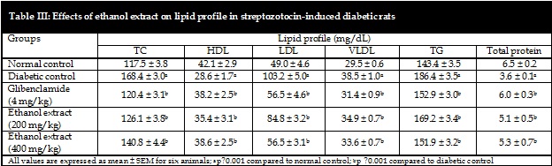 The purpose of the present study was investigating the GC-MS analysis, preliminary phytochemical screening, physicochemical analysis and anti-diabetic activity of ethanol extract of the leaves of Jasminum cuspidatum. The anti-diabetic activity was investigated in streptozotocin-induced diabetes rats with treatment of ethanol extract at the dose level of 200 and 400 mg/kg, which was compared with glibenclamide at a dose level of 4 mg/kg and the parameter measured being the blood glucose, total cholesterol, HDL, LDL, VLDL, triglycerides, and total protein. An oral glucose tolerance test (OGTT) was also investigated in experimental rats. The GC-MS analysis revealed that the ethanol extract contained seven phytoconstituents. Preliminary phytochemical screening showed the presence of triterpenoids, flavonoids, glycosides and steroids. The result of in vivo anti-diabetic activity revealed that the ethanol extract of J. cuspidatum showed significant anti-diabetic activity.
