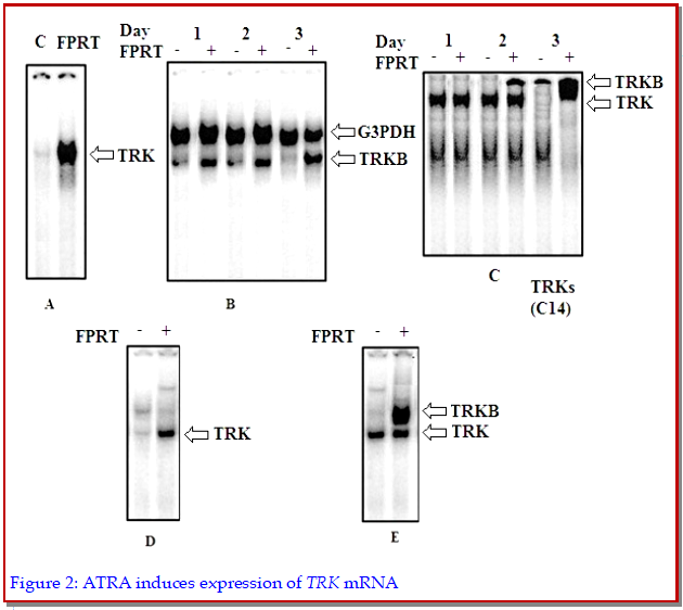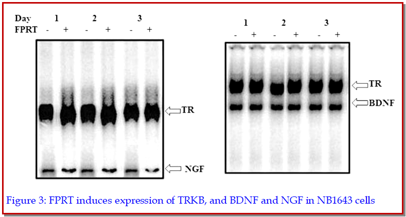In the present study, fluorophenyl retinoic acid triazole, a retinoic acid derivative having more bioavailability compared to the parent retinoic acid was investigated against cell growth and proliferation. The results indicated that fluorophenyl retinoic acid triazole leads to a significant expression of TRK mRNA in time a dependent manner in NB1643 cells. There were about 10-, 14-, and 21-fold induction of expression after 1, 2, and 3 days of treatment, respectively. The results revealed that TRK and TRKB were induced at 6 and 12 hours afterthe treatment respectively and the expression of TRKB was maximum at day 3. Fluorophenyl retinoic acid triazole exerts neurite outgrowth activity by inducing TRKB expression, which is a receptor for brain-derived neurotrophic factor and a protein-tyrosine kinase. Fluorophenyl retinoic acid triazole accumulation generates many small vesiclesin the cell which assembles at the neck of each small prominence and lead to significant morphological changes after 24 hours of treatment.