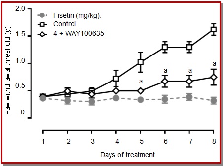 Common chemotherapeutic agents such as oxaliplatin often cause neuropathic pain during cancer treatment in patients. Such neuropathic pain is difficult to treat and responds poorly to common analgesics, which represents a challenging clinical issue. Fisetin is a naturally occurring flavonoid and this study tested the potential anti-hyperalgesic effects of fisetin in a mice model of oxaliplatin-induced neuropathic pain. Fisetin (1-4 mg/kg, i.p.) did not significantly alter the mechanical hypersensitivity in oxaliplatin-treated mice but produced a dose-dependent anti-hyperalgesic effect during repeated treatment. Repeated treatment with fisetin also prevented chronic neuropathic pain-induced depressive-like behavior in a forced swimming test. Both the antihyperalgesic and the antidepressant-like effects of fisetin can be blocked by a selective 5-HT1A receptor antagonist WAY100635 (1 mg/kg). Together, these results demonstrate that fisetin has significant analgesic efficacy against chronic neuropathic pain, which could be a useful analgesic in the management of neuropathic pain.