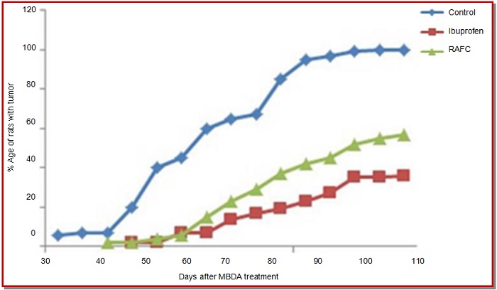 The study was devised to investigate the effect of retinoic acid trifloromethyl chalcone (RAFC) on mammary carcinogenesis in female rats. The data revealed a significant decrease in number of rats with mammary tumor, number of tumors per rat and tumor volume by 54, 72 and 75% respectively in RAFC group compared to control group. The ibuprofen treated rats also showed a significant decrease in number of rats with tumor, number of tumors per rat and tumor volumes by 43%, 55%, and 59%, respectively. Treatment of rats with RAFC also increased the latency period of tumor induction significantly. Median detection period (50% of tumors) was 92, 83 and 56 days respectively in the rats from RAFC, ibuprofen and control groups respectively after DMBA induction. These results demonstrate that RAFC possesses strong chemopreventive activity against mammary carcinogenesis.