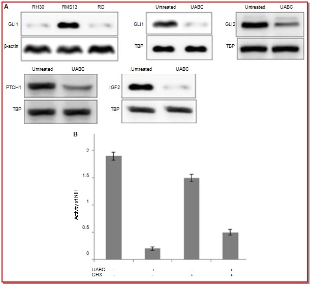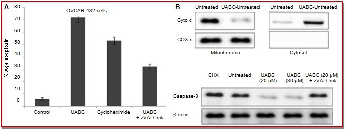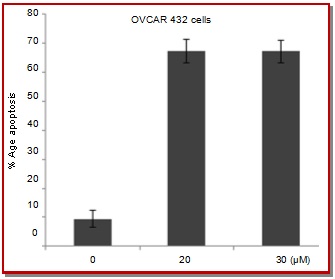 In the present study, the effect of ursolic acid benzaldehyde chalcone (UABC) on ovarian carcinoma cells was studied. The results revealed that ovarian carcinoma cells on UABC treatment increased Sub-G1 cell population, increased rate of cell apoptosis and morphological changes in mitochondrial membrane. In OVCAR 432 cells treatment with UABC increased the Sub-G1 cell population to 72.3% and growth inhibition rate of >72%. Treatment with 20 µM of UABC for 48 hours, led to an induction of apoptosis in 67.2% and induced morphological changes in OVCAR 432 cells. The Western blot results showed high concentration of cytochrome c in the cell cytosol after 48 hours of UABC treatment. Treatment of RMS-13 cells with UABC resulted in inhibition of GLI1, GLI2, PTCH1, and IGF2 genes. In addition, we found a significant reduction in hedgehog activity of RMS-13 cells after UABC treatment by means of a hedgehog-responsive reporter assay. Therefore, UABC can be a promising agent for the treatment of ovarian carcinoma.
