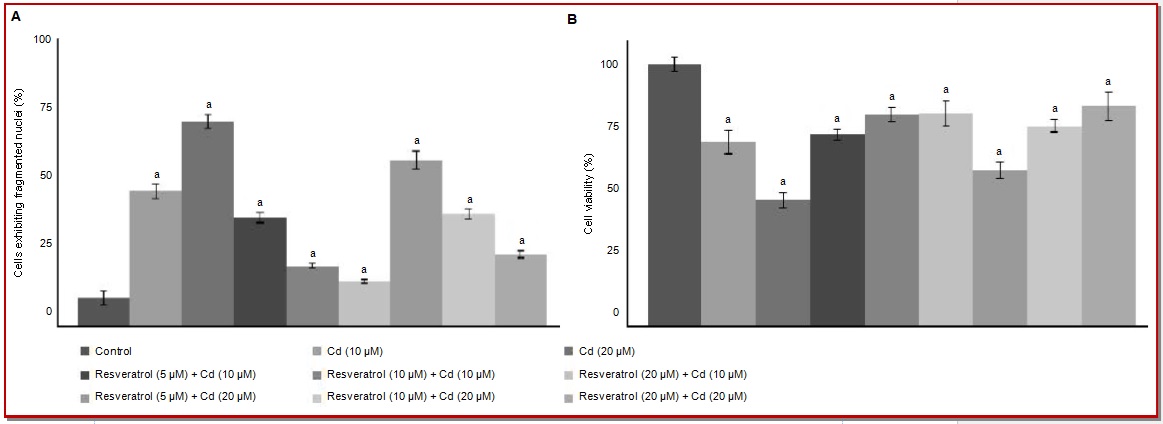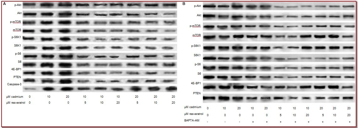 Cadmium, a toxic environmental contaminant, induces oxidative stress leading to various neurodegenerative disorders, where it interferes with homeos-tasis of intracellular free calcium ([Ca2+]i), leading to cellular damage and apoptosis. We investigated whether resveratrol, a plant-derived antioxidant could offer protection against cadmium-induced neuroapoptosis. Primary cortical neurons were exposed to cadmium (10 or 20 µM) with/without prior exposure to resveratrol (5, 10 or 20 µM) for 12 hours and unexposed cells served as control. Resveratrol caused marked reduction in cadmium-induced neuronal apoptosis and down-regulated caspase-3 expressions. Cadmium-induced marked elevations in reactive oxygen species, and ([Ca2+]i) levels were potentially reduced by resveratrol. Resveratrol effectively regulated the alterations observed in the activation levels of mitogen-activated protein kinases (MAPKs) and proteins of mammalian target of rapamycin (mTOR) pathways. Thus, resveratrol effectively protected the cortical neurons exposed to cadmium by modulating the ([Ca2+]i) levels and regulating the MAPK/mTOR pathways.