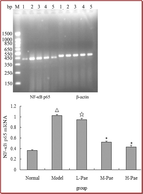 The aim of this study was to investigate the effects of paeonol on the expression of NF-κB pathway induced by homocysteine. After Human umbilical vein endothelial cells exposed to homocysteine for 24 hours, paeonol (0.15-0.6 mmol/L) improved the cell viability (p<0.05). NF-κB p65 mRNA expression was reduced largely (p<0.05) and IκB-α protein expression increased significantly (p<0.01). The staining of NF-κB p65 in nucleus was not as much as those in homocysteine injured model group (p<0.01). Therefore, paeonol can inhibit IκB-α protein degradation and suppress NF-κB transferred into nuclear in order to inhibit the activation of NF-κB.