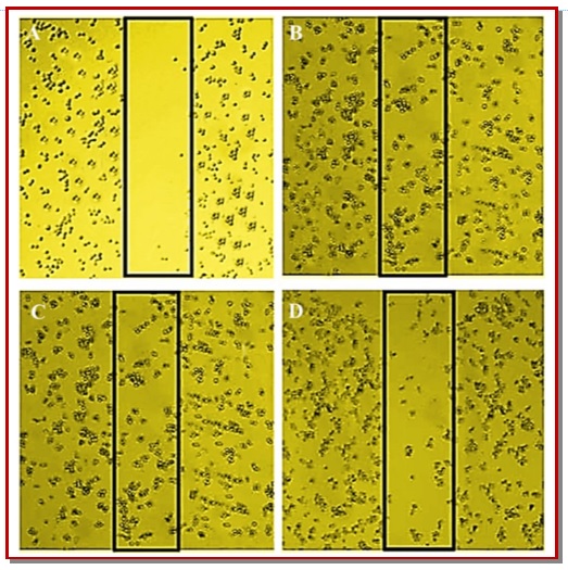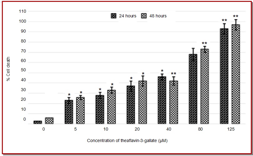 The objective was to determine the antiproliferative and apoptotic effects of theaflavin-3-gallate in human non-small cell lung cancer cells (A-549) along with determining the effect on cell cycle phase distribution, cell migration and invasion. Cell viability was determined by MTT assay while as phase contrast and fluorescence microscopies were involved to study apoptotic morphologi-cal features in these cells. Flow cytometry investigated the effect of theaflavin-3-gallate on cell cycle phase distribution. Theaflavin-3-gallate treatment led to a substantial cytotoxic effect in A-549 cancer cells with IC50 values of 42.1 µM and 27.9 µM at 24 and 48 hours respectively. Further, 80 and 160 µM dose of theaflavin-3-gallate induced apoptotic features including chromatin margina-tion and micronuclei presence. The population of cells in G2/M phase increased from 2.7% (control) to 6.8%, 17.2% and finally to 46.5% after treatment with 20, 80 and 160 µM concentration of theaflavin-3-gallate respectively indicating G2/M phase cell cycle arrest.