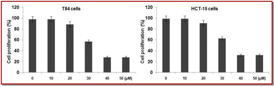 In the present study, the effect of trolox on human colon cancer cell lines was investigated. The results revealed that trolox treatment caused inhibition of cell growth in T84 and HCT-15 colon cancer cell lines in a dose-dependent manner. The inhibition was significant at 50 µM of trolox after 48 hours in both cell lines. Trolox treatment promoted expression of p38 and inhibited expression of survivin and Akt. It also induced cleavage of PARP and caspase-3 and ultimately induced apoptosis in T84 and HCT-15 cells. The tumor growth was inhibited significantly in the xenotransplanted mice on treatment with trolox compared to the control group. Since trolox treatment exhibits inhibitory effect on the proliferation of colon cancer cells and inhibits tumor growth in vivo therefore, can be of therapeutic importance for the treatment of colon cancer.