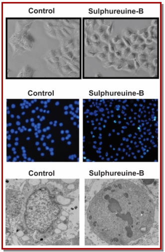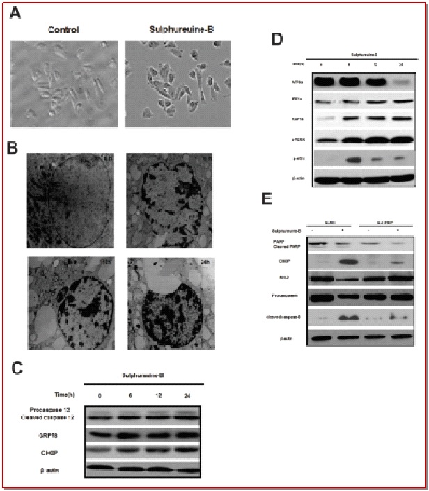A drimane type sesquiterpenoids, sulphureuine B was isolated from the edible mushroom Laetiporus sulphureus and its antiproliferative properties were investigated using U-87MG glioma cells. It was observed that sulphu-reuine B-induced apoptosis in U-87MG cells and the mechanisms involved are endoplasmic reticulum stress, mitochondrial and death receptor mediated pathways. Endoplasmic reticulum stress was identified from the results of enormous cytoplasmic vacuolation, CHOP elevation and caspase-12 cleavage. Further, we found that treatment of sulphureuine B-induced PERK, IRE1?, and ATF6? activations. In addition, sulphureuine B-induced Bcl-2 down-regulation, cleavage of PARP, and caspase-8 activation were also affected. All these experimental results clearly revealed that sulphureuine B-induced apoptosis mediated through endoplasmic reticulum stress, mitochondrial, and death receptor signaling pathways.
