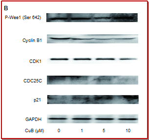 - Figure 6A: Effect of Cucurbitacin B on G2/M cell cycle arrest. Expression of p-Wee1, cyclin B1, CDK1, CDC25C and p21. Ctrl, Control