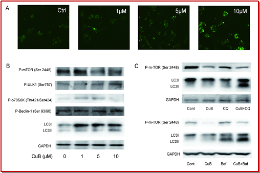 - Figure 7: Autophagic inducible effect of cucurbitacin B on PC12. (A) MDC staining. (B) Expression of p-mTOR (Ser 2448), p-ULK1 (Ser 757), p-p70S6K (Thr421/Ser424), p-Beclin-1 (Ser 93/96), LC3B. (C) Expression of p-mTOR (Ser 2448) and LC3B