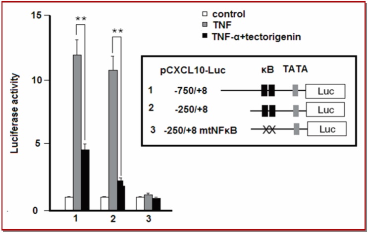 Effective immunomodulator and pro-inflammatory cytokine, Tumor necrosis factor-α (TNF-α) are considered to be responsible for connecting autoimmune pathological process and contagious diseases. TNF-α stimulates the C-X-C motif chemokine 10 (CXCL10) expression that is participated in migration of tumor, metastasis, and invasion. Tectorigenin, an o-methylated isoflavone, is present as a major portion in the Iris tectorum rhizomes. In this study, we investigated the tectorigenin effects as an anticancer drug. The obtained results showed that tectorigenin hinders the invasion of human colon cancer cells (Caco-2). We used reverse transcription PCR, q-PCR and enzyme linked immunosorbent assays to test whether the tectorigenin is involved in the inhibition of TNF-α induced CXCL-10 expression in the Caco-2 cell lines. Further, we tested TNF-α induced NF-κB activity using the tectorigenin. Collective results showed that tectorigenin inhibits the CXCL10 production by using TNF-α via NF-κB inhibition.