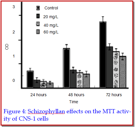 The aim of this study was to examine the anticancer effects of schizophyllan (a -D-glucan) against the growth of rat CNS-1 glioma cells and preliminarily assess its effect on inducing apoptosis and blocking cell cycle. In order to evaluate its inhibitory effect, firstly MTT assay was conducted followed by annexin V/propidium iodide double staining or propidium iodide single staining, apoptosis and cell cycle using flow cytometry. All the experiments were carried in a dose- and time-dependent manner. Experimental results showed that treatment of 40 and 60 mg/L schizophyllan significantly increased the apoptotic rate and blocked the cell cycle. In addition, increase in the proportion of cells in G0/G1 phase and decrease in the proportion of S-phase cells were also observed. Overall experimental studies suggest that schizophyllan can significantly inhibit the growth of rat CNS-1 glioma cells, in vitro and induced apoptosis and blocked the cell cycle.