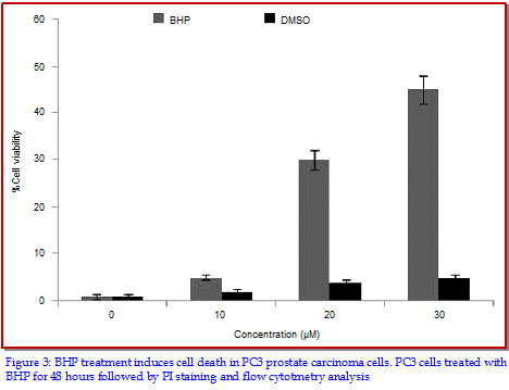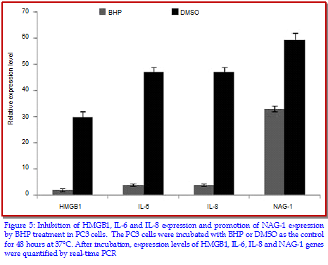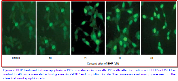 The present study was performed to examine the effect of 5-bromo-3-(3-hydroxyprop-1-ynyl)-2H-pyran-2-one (BHP) on the rate of cell proliferation and apoptosis induction in the PC3, human prostate carcinoma cell line. The cell viability was assayed by using sulphorhodamine B staining and apoptosis by annexin V and flow cytometry analyses. The results revealed that BHP treatment in PC3 cells caused a significant reduction in the rate of cell proliferation in dose- and time-dependent manner. Compared to the un-treated cells, the formation of HUVEC tubes was markedly inhibited on treatment with BHP at a concentration of 30 µM. Further investigation revealed the expression of HMGB1, IL-6 and IL-8, pro-inflammatory cytokines was also inhibited on treatment with BHP. Therefore, BHP treatment plays an important role in inducing apoptosis in the prostrate cells and can be of therapeutic value for the prostate cancer treatment.