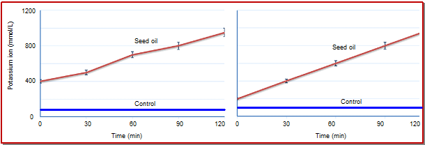 - Figure 1: Effect of the C. bonducella seed oil on the leakage of potassium ions from the tested food-borne pathogenic bacteria L. monocytogenes (a) and E. coli (b)