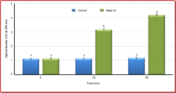 - Figure 2: Effect of the Caesalpinia bonducella seed oil (CBSO) on the release rate of 260-nm absorbing material from L. monocytogenes NCIM 24563 (a) and E. coli ATCC 25922 (b)