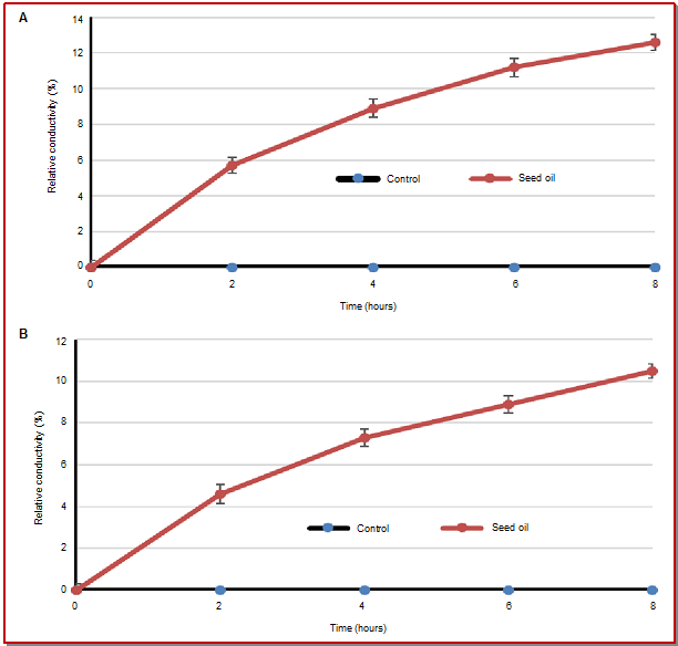 - Figure 3: Effect of Caesalpinia bonducella seed oil on membrane permeability of L. monocytogenes NCIM 24563 (A) and E. coli ATCC 25922 (B)