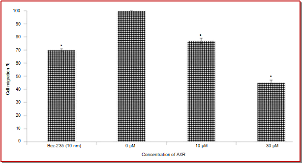 - Figure 6: Significant decrease in cell migration at 30 µM as compared to untreated (0 µM)