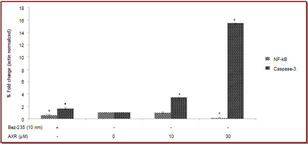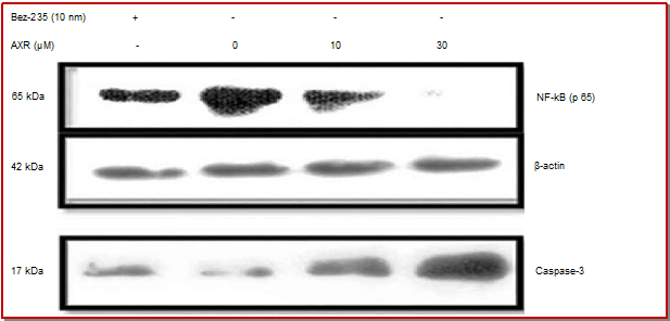 - Figure 4: Acetoxyroyleanone treatment led significant decrease in NF-?B (p65) and increase in caspase-3 expression at 30 µM with respect to untreated and BEZ-235 (10 nm)