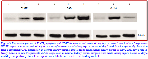 The role of the P2X7R in developing acute kidney injury is unknown. In this study, we developed acute kidney injury mouse model system using 0.75% adenine and examined for renal damage using histology on day 2 and day 4. P2X7 antagonist (A438079) was used to study the recovery process after initial damage and it shows positive histological data. The P2X7R expression on the day 2 and day 4 of acute kidney injury was studied using immunohisto-chemistry and Western blotting. Result shows elevated expression as acute kidney injury progress. Later the P2X7R expression was compared with apoptotic signal and stem cell specific marker (CD133). The results conclude that the apoptotic signals are mainly associated with advanced stage of acute kidney injury but not much in day 2. Similarly, CD133 expression was mask-ed in latter stages of injury following elevated expression in the initial stages.