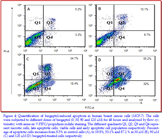 The aim of the present research work was to investigate the anti-cancer and apoptotic effects of bergaptol in human breast cancer cells (MCF-7). The effects on cell cycle arrest and caspase activation were evaluated. MTT assay was used to evaluate the effect of the compound on cell viability. Cellular morphology was demonstrated by fluorescence microscopy. Flow cytometry was used to analyze effect of bergaptol on cell cycle and apoptosis. The results revealed that bergaptol induced dose-dependent cytotoxic effect on MCF-7 cell viability showing IC50 value of 52.2 µM. Bergaptol induced both early and late apoptosis in concentration-dependent manner. After treatment with bergaptol, an increase in the proportion of cells in the S-phase (37.2, 45.3 and 65.1% as compared to 28.6% in untreated cells) and a reduction in the fraction of cells in the G1 phase (44.1, 41.6 and 35.2% as compared to 51.2% in the untreated cells) was observed.