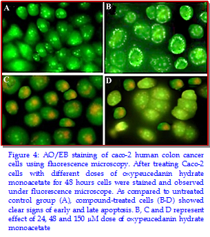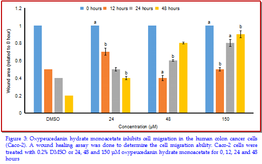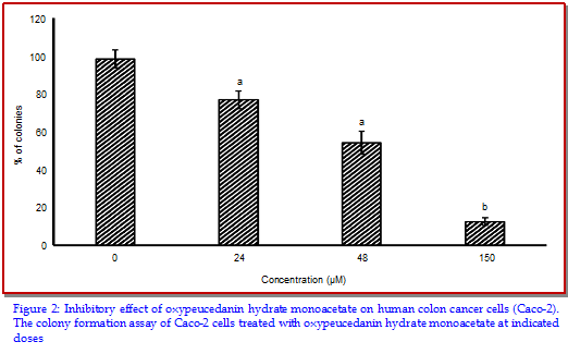 The main aim of the present research work was to demonstrate the antitumor and apoptotic activities of oxypeucedanin hydrate monoacetate isolated from Angelica dahurica against Caco-2 colon cancer cells. MTT cell viability assay along with clonogenic assays were used to study the effect of the compound on cell cytotoxicity and the colony forming tendency. Fluorescence microscopy using acridine orange/ethidium bromide was used to study the effects on apoptosis. In vitro wound healing assay and Western blotting were carried out to study effect on cell migration and PI3K-signalling pathway. The results revealed that oxypeucedanin hydrate monoacetate inhibited Caco-2 cell proliferation and decreased the number of cancer colony forming cells. This compound exerted anti-migratory effects in dose- and time-dependent manner. As compared to the untreated control, drug-treated cells showed significant inhibition of cancer cell migration. Oxypeucedanin hydrate monoacetate significantly down-regulated the expression of pAkt and pPI3K in Caco-2 cells.