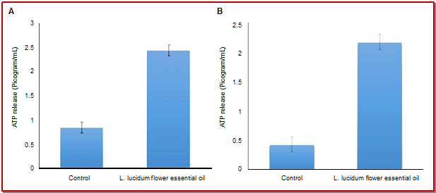 - Figure 2: Effect of flower essential oil of Ligustrum lucidum on extracellular ATP concentration of S. aureus KCTC-1621 (A) and S. enterica ATCC-4731 (B)
