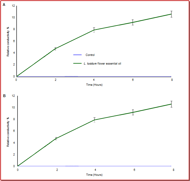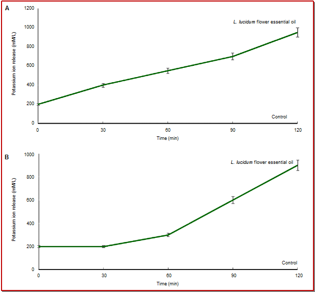 - Figure 3: Effect of flower essential oil of Ligustrum lucidumon leakage of potassium ions from the tested pathogenic bacteria of S. aureus KCTC-1621 (A) and S. enterica ATCC-4731 (B)