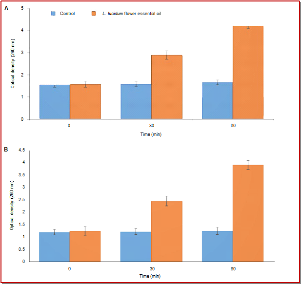 - Figure 4: Effect of flower essential oil of Ligustrum lucidum on the release rate of 260 nm absorbing material from S. aureus KCTC-1621 (A) and S. enterica ATCC-4731 (B)