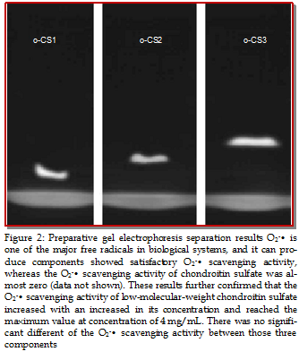 Low-molecular-weight chondroitin sulfate was obtained by degradation of chondroitin sulfate using hyaluronidase. Then, separated with sephadex G25, DEAE-52, and finally purified with AKATA superpeptide separation system and fluorescence-assisted carbohydrate electrophoresis. The main compo-nents detected by high performance gel-filtration chromatography were disaccharide, tetrasaccharide, hexasaccharide with molecular weight of 521, 1024 and 1527 Da, respectively. The anti-oxidant activity of these three oligosaccharides in vitro showed that the reducing power (maximum value at 10 mg/mL) and superoxide anion radical scavenging abilities were increased (maximum value at 4 mg/mL) with an increased in their concentration. There were no significant differences of the anti-oxidant properties between those three oligosaccharides.