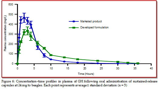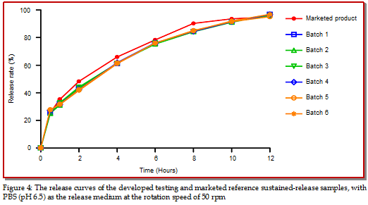 In present study, a novel galantamine hydrobromide sustained-release capsule was prepared with the extrusion-spheronization method and the optimized preparative formulation. The release studies were performed using marketed capsules (Razadyne ER) as a reference and data were analyzed in terms of cumulative release amounts as a function of time. Furthermore, fiber-optic real time detection was adopted to monitor the release process. Results demonstrated that our developed formulation had superior properties, worked better as sustained-release carriers and lasted longer time to release compared with the marketed product. The in vitro release characteristics of different batches of preparations were quite similar with each other, the total release proportions of galantamine hydrobromide from sustained-release capsules reached higher than 90% within 12 hours. Similar factors f2 of two preparations were all higher than 50, the release profile of drugs from capsules fitted to Higuchi model with the equation of Q% = 0.2681t1/2 + 0.0684 (r = 0.9966). Pharmacokinetics profile and parameters in beagle dogs after oral administration also revealed the superior release performances of new capsules being consistent with the in vitro study. The developed sustained-release formulation may be a promising alternative dosage form for treatment of related diseases.