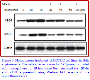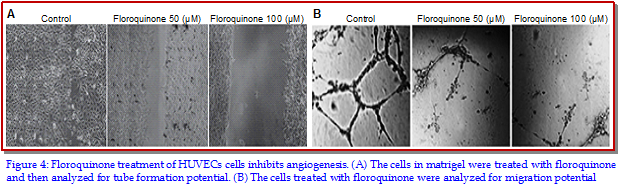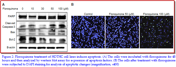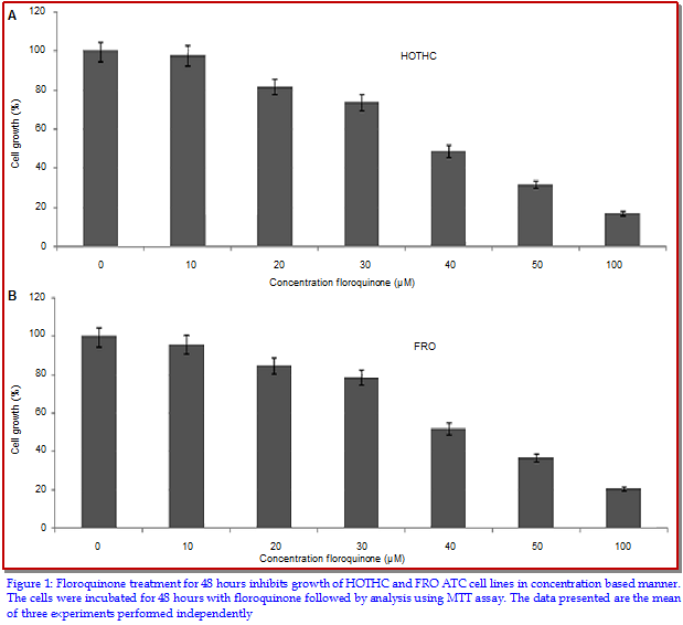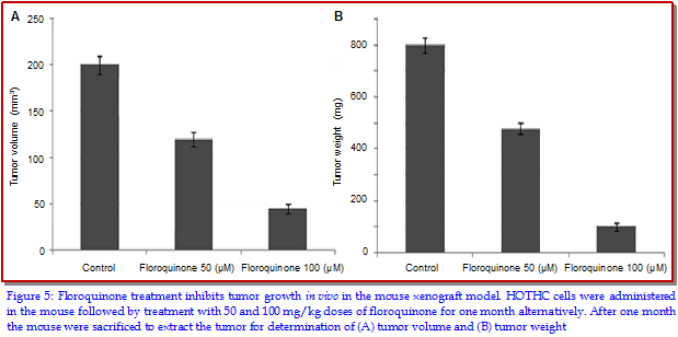 In the present study, effects of floroquinone on anaplastic thyroid cancer cell lines and mouse tumor xenografts were investigated. Increase in the concentration of floroquinone from 10 to 100 µM reduced the cell growth from 98 to 17% after 48 hours in HOTHC cells. Similarly, in FRO cells growth rate was found to be 96 and 21%, respectively at 10 and 100 µM concentra-tions of floroquinone. Western blot analysis showed a marked reduction in Bcl-2 expression and increased in Bax, caspase-3 and cleaved PARP expression in HOTHC cell lines on treatment with floroquinone. Floroquinone treatment of the HOTHC cells led to inhibition of the cobalt chloride-induced increase in the hypoxia-inducible factor 1α (HIF-1α) and vascular endothelial growth factor expression. In HOTHC cells, floroquinone treatment inhibited the tube formation and migration potential significantly compared to control cells. Treatment of the mouse bearing HOTHC tumor xenograft with 50 and 100 mg/kg doses of floroquinone alternatively for one month reduced the tumor volume to 48 and 17%, respectively compared to the control. Thus, floroquinone effectively inhibits growth of thyroid cancer and can be used for its treatment.