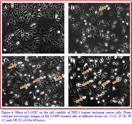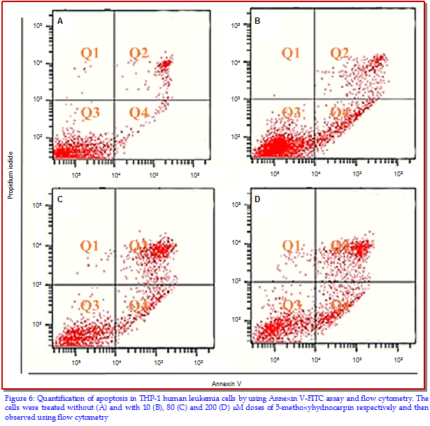 The primary objective of the current investigation was to study the anti-tumor effects of 5-methoxyhydnocarpin in THP-1 human leukemia cells along with evaluating its effects on apoptotic induction, cancer cell migration and cell cycle phase distribution. MTT cell viability assay revealed the cell cytotoxic effects while as clonogenic assay revealed the effects of the compound on colony formation tendency. Phase contrast microscopy revealed the effects on cell morphology while as its effects on cell cycle and apoptosis induction were evaluated by flow cytometer. Results showed that 5-methoxyhydnocarpin induced both anchorage-dependent and anchorage-independent cytotoxic effects in THP-1 cells. 5-Methoxyhydnocarpin-treated cells exhibited significant changes in cell morphology. Flow cytometry experiment indicated that 5-methoxyhydnocarpin led to sub-G1 cell cycle arrest and also led to early and late apoptosis.