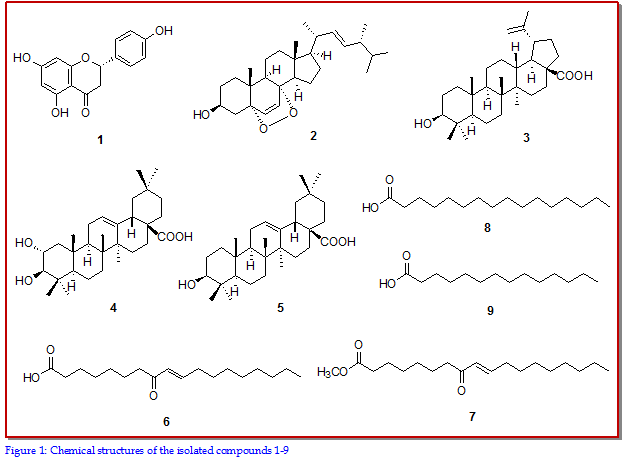 Sphagnum palustre (a moss) has been traditionally used in Korea for the cure of several diseases such as cardiac pain and stroke. In this research, the inhibitory effect of S. palustre on aromatase (cytochrome P450 19, CYP19) activity was studied. [1?-3H] androstenedione was used as a substrate and incubated with S. palustre extract and recombinant human CYP19 in the presence of NADPH. S. palustre extract inhibited aromatase in a concentration-dependent manner (IC50 value: 36.4 ± 8.1 µg/mL). To elucidate the major compounds responsible for the aromatase inhibitory effects of S. palustre extract, nine compounds were isolated from the extract and tested for their inhibition of aromatase activity. Compounds 1, 6, and 7 displayed aromatase inhibition, while the inhibition by the other compounds was negligible.