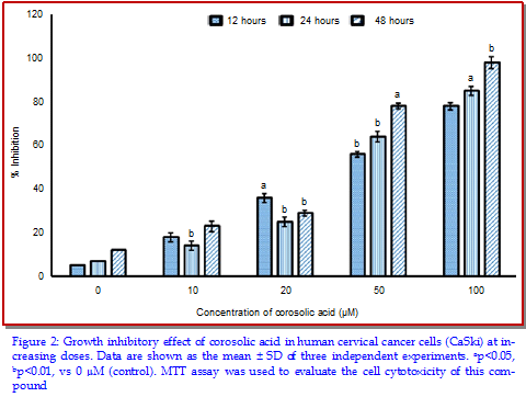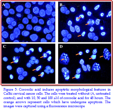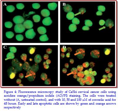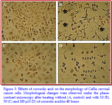 The main objective of the present study was to investigate the anti-tumor activity of corosolic acid in CaSki human cervical cancer cells. Fluorescence and phase contrast microscopic techniques were used to study the effect of the compound on cellular morphology and apoptosis. Results revealed that corosolic acid exerted potent, dose- and time-dependent growth inhibitory effects in CaSki cell proliferation. Cells got detached from one another making clusters of small number of cells floating in the medium. After the cells were treated with 10, 50 and 100 µM concentrations of corosolic acid, cells began to emit orange red fluorescence more heavily at the centre of cells indicating apoptosis. Corosolic acid also induced G2/M cell cycle arrest in a dose-dependent manner. Increasing doses of corosolic acid treatment to these cells resulted in significant and dose-dependent down-regulation of PI3K and Akt protein expressions.