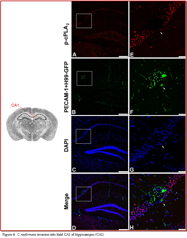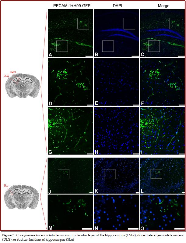 Aim of this study was to locate the brain regions where Cryptococcus interact with brain cells and invade into brain. After 7 days of intratracheal inocula-tion of GFP-tagged Cryptococcus neoformans strains H99, serial cryosections (10 ?m) from 3 C57 BL/6 J mice brains were imaged with immunofluorescence microscopy. GFP-tagged H99 were found in some brain regions such as primary motor cortex-secondary motor cortex, caudate putamen, stratum lucidum of hippocampus, field CA1 of hippocampus, dorsal lateral geniculate nucleus, lateral posterior thalamic nucleus, laterorostral part, lateral posterior thalamic nucleus, mediorostral part, retrosplenial agranular cortex, lateral area of secondary visual cortex, and lacunosum molecular layer of the hippocampus. The results will be very useful for further exploring the mechanism of C. neoformans infection of brain.
