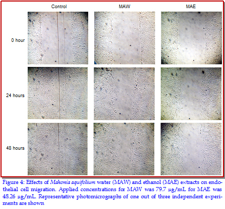 The cytotoxicity of Mahonia aquifolium ethanol and water extracts was examined using MTT test. The morphological changes were analyzed by fluorescence microscopy. Cell cycle distribution and possible activation of caspase-dependent pathway of cell death were assessed by flow cytometry. The effects of ethanol and water extracts on migration of endothelial EA.hy926 cells were analyzed by in vitro scratch assay and inhibition of angiogenesis was detected using tube formation assay. Both extracts demonstrated cytotoxic effects on cancer cell lines with very high selectivity. Morphological evaluation indicated apoptosis. These results were confirmed with cell cycle analysis, where there was accumulation of cancer cells in the subG1 phase. Ethanol and water extracts induced a caspase-dependent apoptosis in HeLa cells through activation of caspase-3 and caspase-8. Both extracts showed the ability to inbibit the migration of EA.hy926 cells and initial steps of angiogenesis. In addition, ethanol extract exerted significant anti-angiogenic effect.