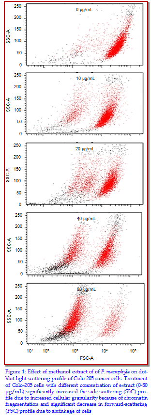 The primary objective of the current work was to investigate the antitumor potential of Primula macrophylla extracts in human colon cancer cell line (Colo-205) along with evaluating the effects on apoptosis induction, cell cycle arrest and mitochondrial membrane potential. Cell viability was assessed by tetrazolium-based MTT assay. Flow cytometry measurement was carried out to assess the effect of the extract on cell cycle phase distribution and mitochondrial transmembrane potential. Results showed that P. macrophylla methanol extract was effective and exhibited highest cell growth inhibition (IC50 value, 26.17 ?g/mL). Methanol extract significantly increased the side-scattering profile of Colo-205 cells in concentration-dependent pattern. Exposure of Colo-205 cells with different concentrations of the methanol extract (0-80 ?g/mL) caused dose-dependent G0/G1 cell cycle arrest along with inducing apoptotic cascade by increasing the population of cells at G0/G1 phase. Furthermore, methanol extract treatment caused an increase in mitochondrial membrane depolarization in Colo-205 cells.