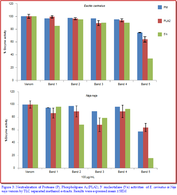 Canthium parviflorum is used in the traditional therapy to treat snakebite victims. In the present study, partially purified methanol root extract of C. parviflorum was used for the neutralization of Eachis carinatus and Naja naja venom. The extract inhibited in vitro phosphomonoesterase, phosphodiesterase, acetylcholinesterase, hyaluronidase, protease, phospholipase A2 and 5nucleotidase activities of both venoms. One of the promising band exhibited neutralization of all the in vitro enzyme activities and was further subjected to GC-MS analysis which revealed the presence of eight active phytocompounds. These phytochemicals might be responsible for in vitro enzyme neutralization. Methanol extract possesses potent active phytochemicals against the site specific toxins and hydrolytic enzymes analyzed.